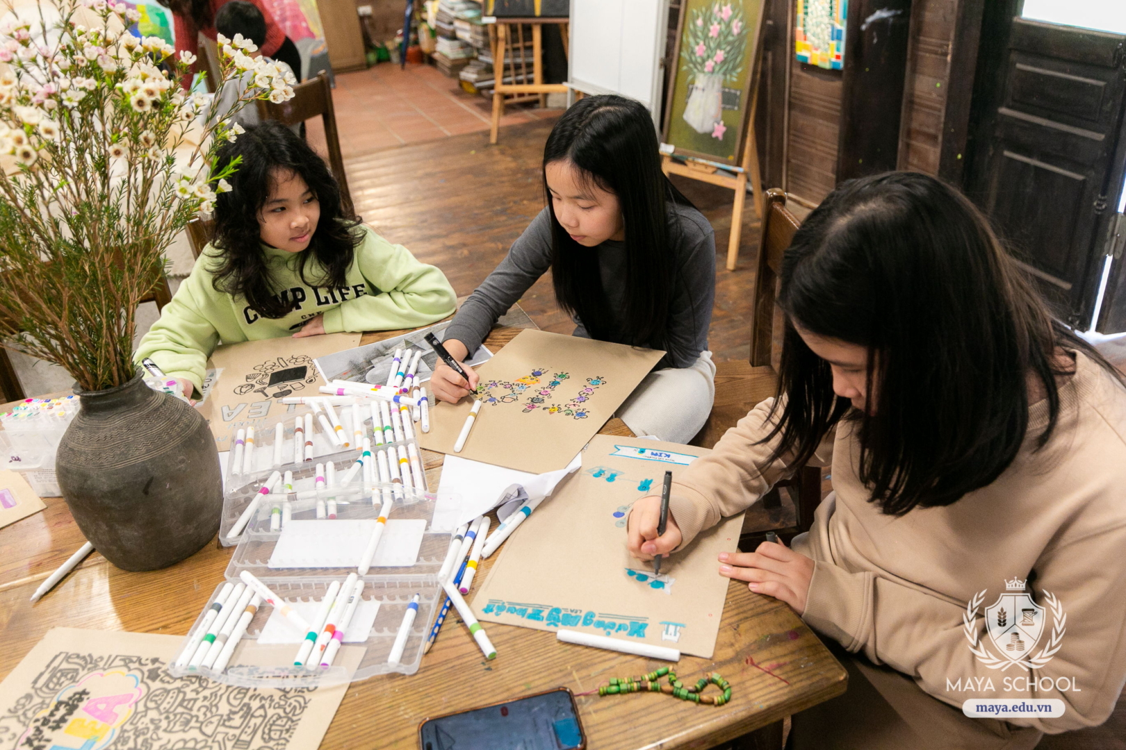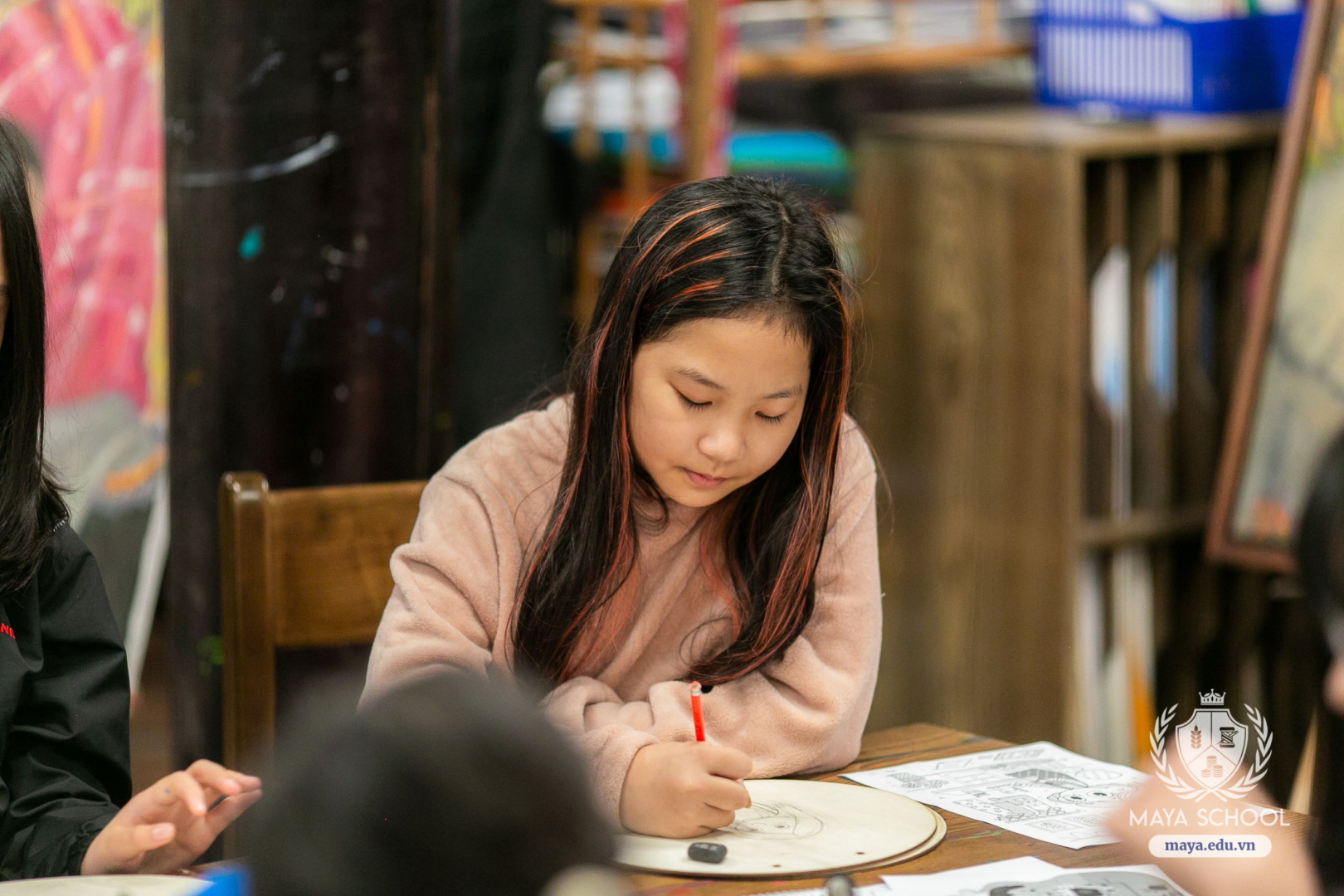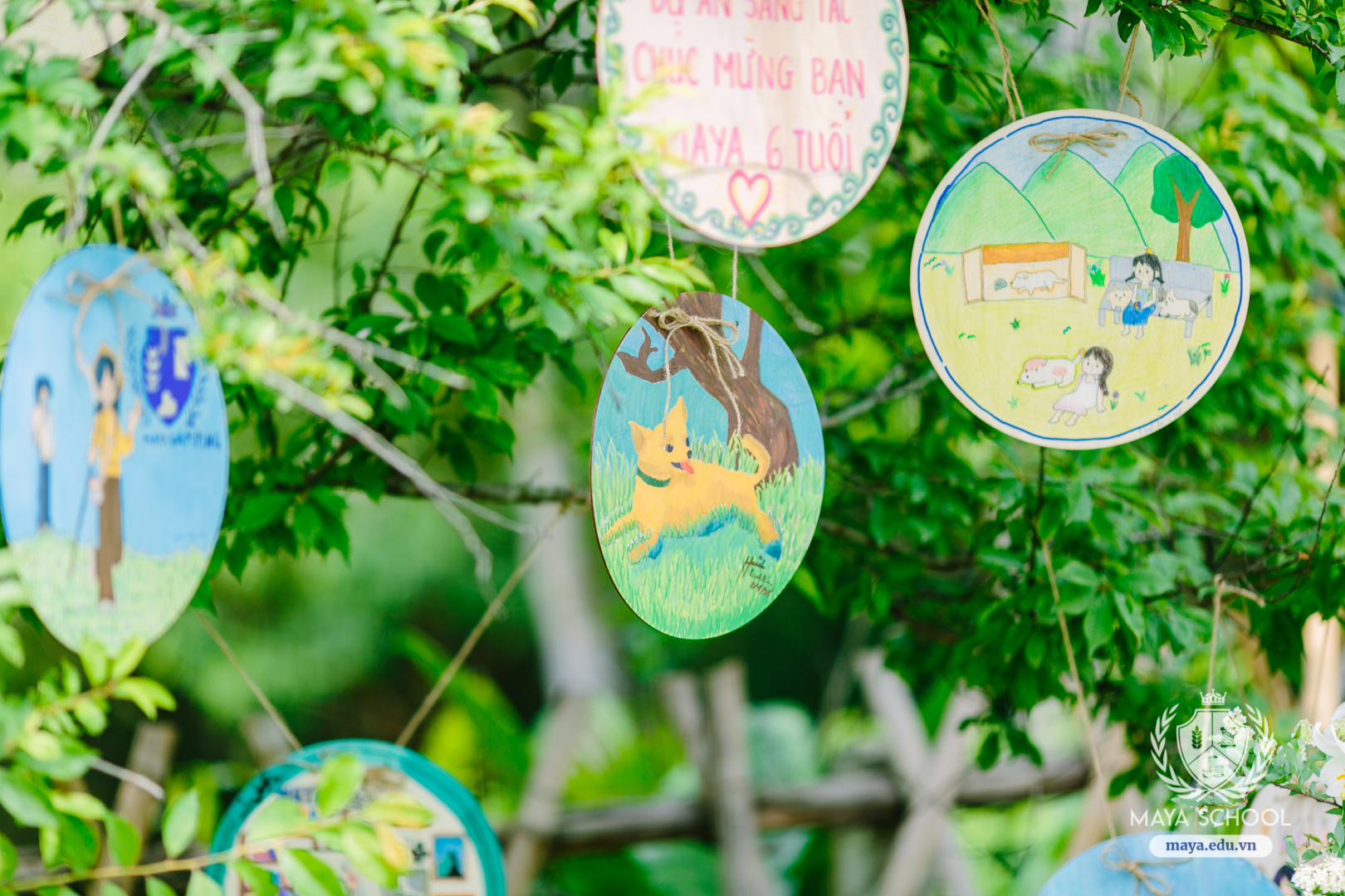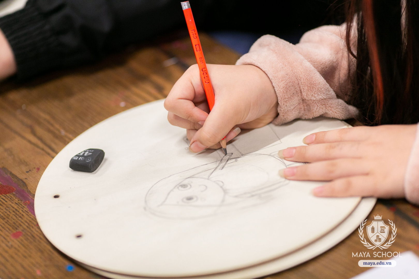 Sau khi đã nắm vững kiến thức, các con bước vào giai đoạn sáng tác trên chất liệu gỗ, với chủ đề mừng sinh nhật trường. Những hình ảnh đặc trưng của Maya như bụi tre, cánh rừng, cho đến những thành viên đặc biệt của Làng Maya như chú cún Song Ngư… đều trở thành cảm hứng cho các con tạo nên những tác phẩm đầy màu sắc vả cảm xúc, để chào đón dấu mốc quan trọng của Maya. Những tác phẩm này được trưng bày trong lễ kỉ niệm Maya 6 tuổi và trở thành một phần đẹp đẽ trong sự kiện năm nay.