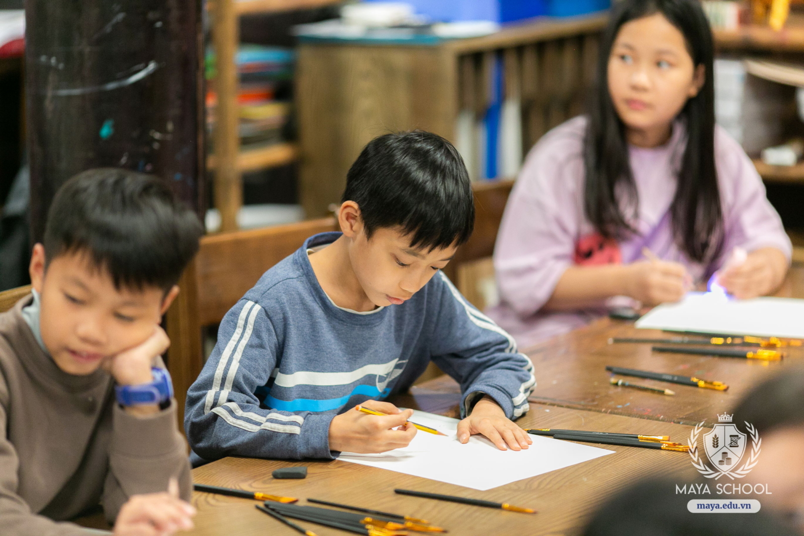 Dự án đầu tiên mà nhóm thực hiện là sáng tác những tác phẩm chúc mừng Maya tròn 6 tuổi. Để chuẩn bị, các cô giáo trong xưởng tổ chức những buổi học chuyên sâu về hình khối, sắc độ đậm nhạt – sáng tối, kỹ thuật vẽ khối bằng chì và ký họa ngoài trời. Từ đó, các con có cái nhìn rõ hơn về bố cục tranh và cách tạo ra độ sâu bằng cách phối hợp sáng tối. Những kiến thức này là nền tảng, được các con áp dụng trong cả ba dự án nhỏ trong năm học này.