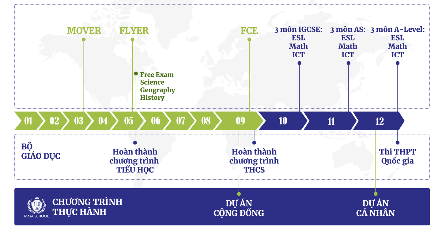 Với lộ trình học thuật Tiểu học được thiết kế chặt chẽ, trong đó học sinh Maya tham gia vào các kì thi bao gồm: