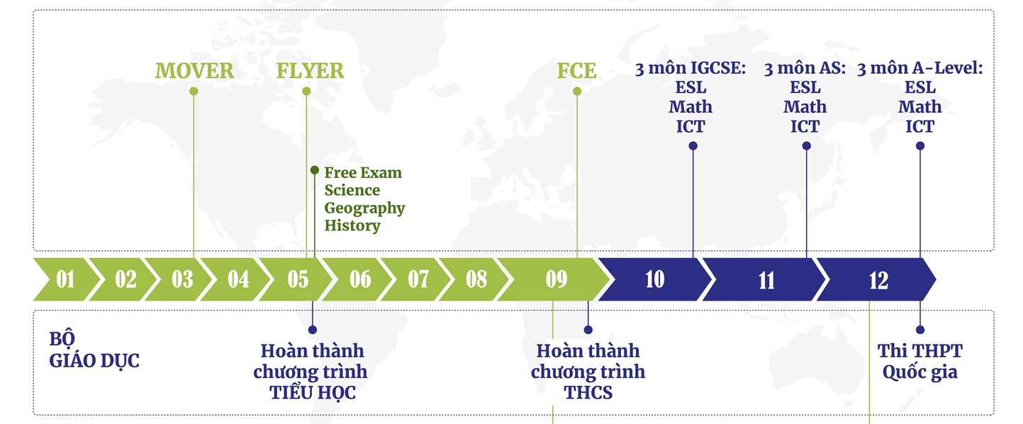+ Thực hiện các Dự án nghiên cứu liên môn Science – Geography – History bằng Tiếng Anh với Giáo viên Montessori Nước ngoài ở giai đoạn Tiểu học; Học và tham gia các kỳ thi Cambridge ở 3 môn ESL, Math, ICT ở giai đoạn Trung học – sẵn sàng để đi du học và trở thành công dân toàn cầu trong tương lai;